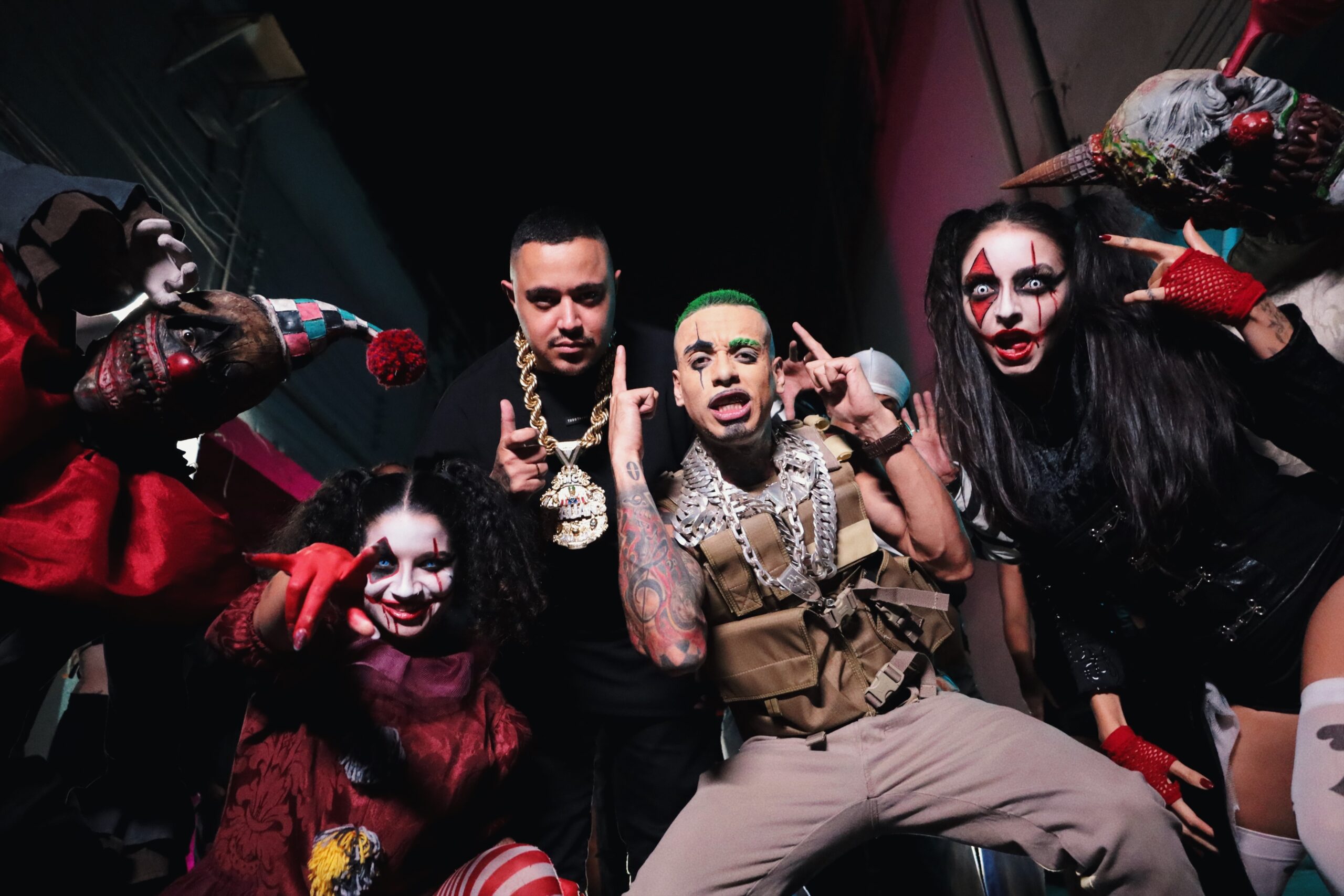 MC Kauan, caracterizado como o coringa (ao centro) durante as gravações do clipe de “SET DO KAUAN 2.0” – crédito: Divulgação GR6 / @vicb__